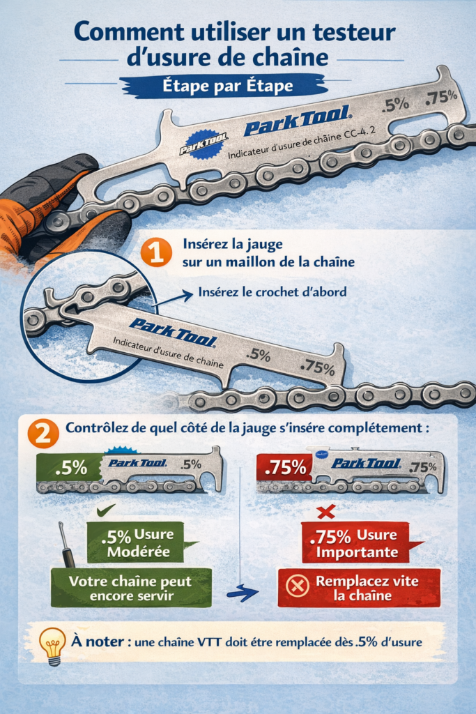 - Vérifiez la tension et l’usure avec un outil de mesure de chaîne.