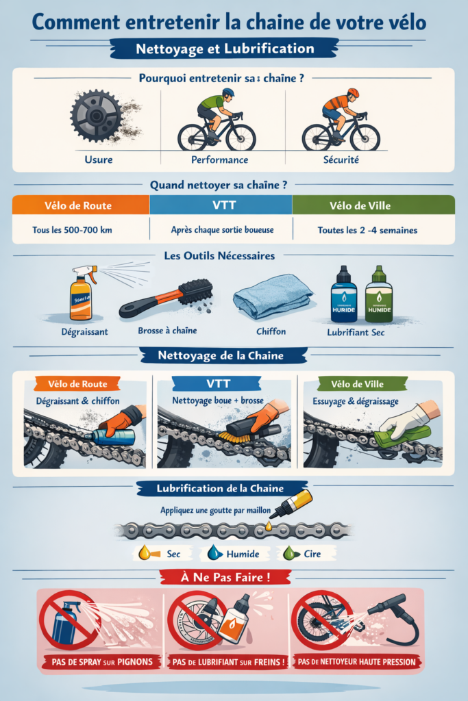 - Améliorer la performance : une chaîne propre et lubrifiée réduit la friction.