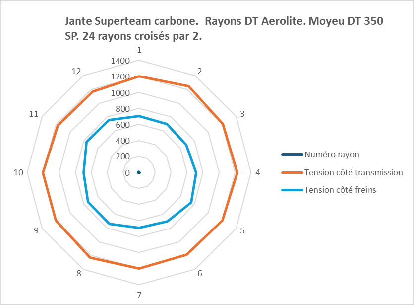 Voici un exemple de rapport de contrôle sur une roue arrière de course. Vous noterez la remarquable homogénéité des tensions côté transmission, nappe la plus sollicitée. Un tel rapport est disponible sur demande pour les plus exigeants.