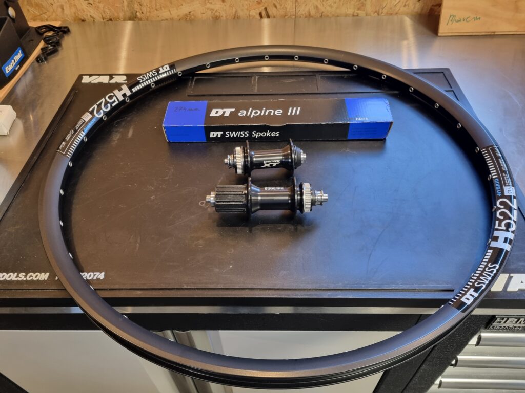 Je commence par bien choisir mes composants en fonction de l’usage recherché : ici pour un tandem c’est la robustesse qui prime ! La jante est à double paroi renforcée avec des oeillets. Les rayons sont au nombre de 32 et adaptés à de fortes sollicitations. Les écrous de rayons seront en laiton, un peu plus lourds mais plus résistants. Les moyeux sont robustes également, conçus pour un usage VTT.