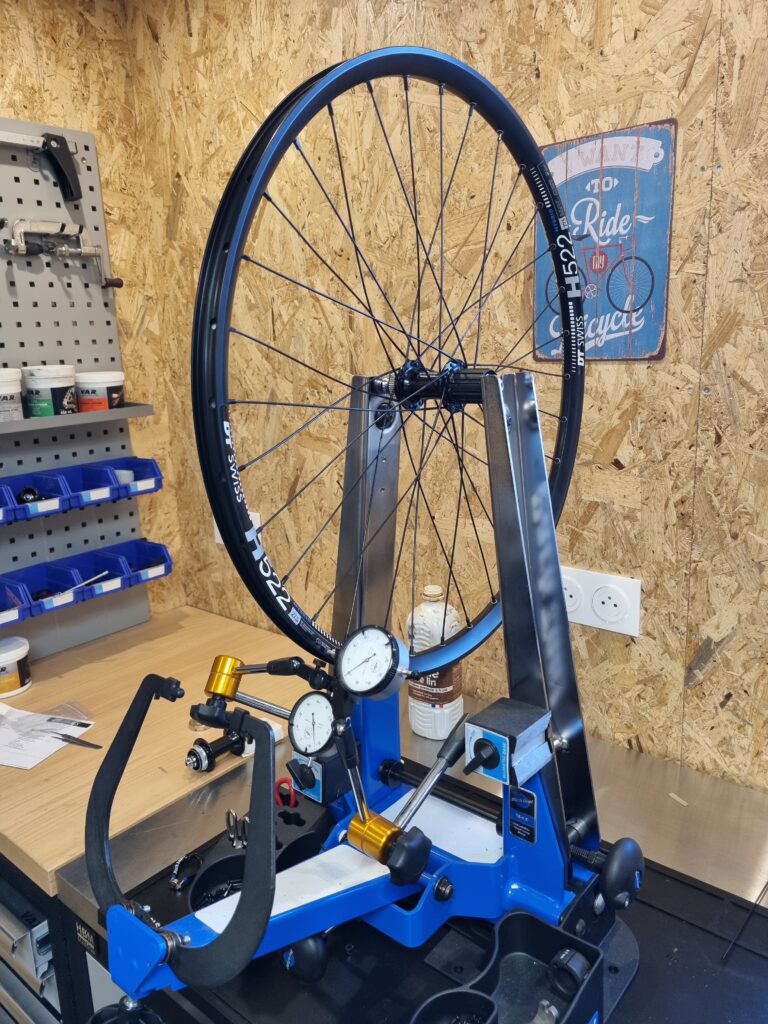 Une fois la roue centrée approximativement il est temps de vérifier le centrage par rapport au moyeu. J’utilise un comparateur dédié pour cette opération.